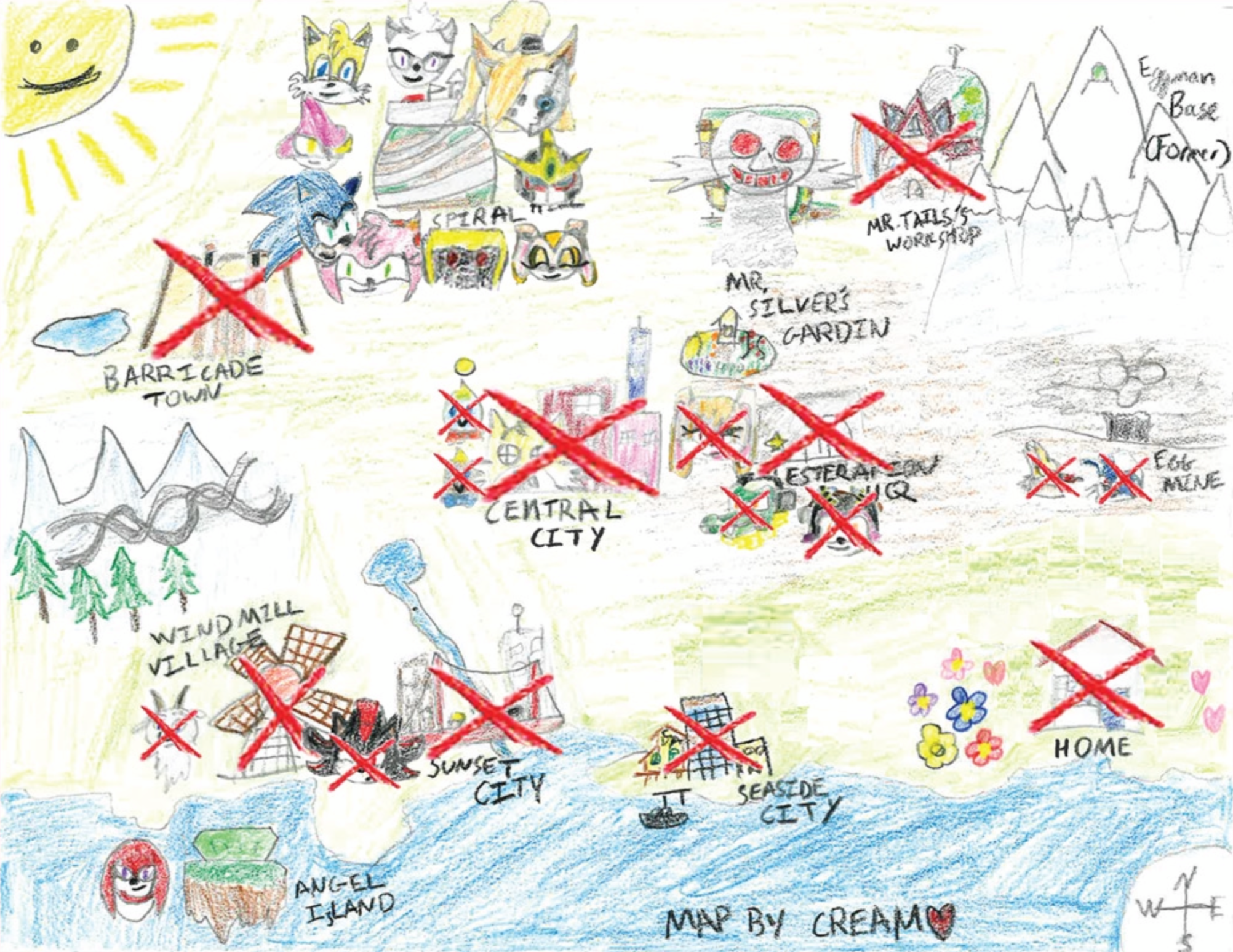 - Story so far...: "Story so far..." is a summary of the current plotline for the comic. It features a landscape drawing by Cream of various locations that have been established in the series and some that have yet to be introduced. The people and locations on the map that have been marked with a red X indicate that they have been affected by the Metal Virus.