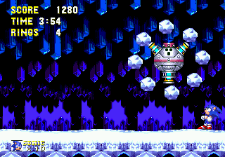 The sub-boss of IceCap Zone is the Big Icedus. It appears at the end of IceCap Zone Act 1 where it descends into the arena. There, it summons seven ice blocks around it for protection and begins flying in a "U" shape across the screen once or twice. The player must hit it right after it throws the ice blocks into the air, which will then fall down in a certain pattern. Six hits are required to destroy it.
