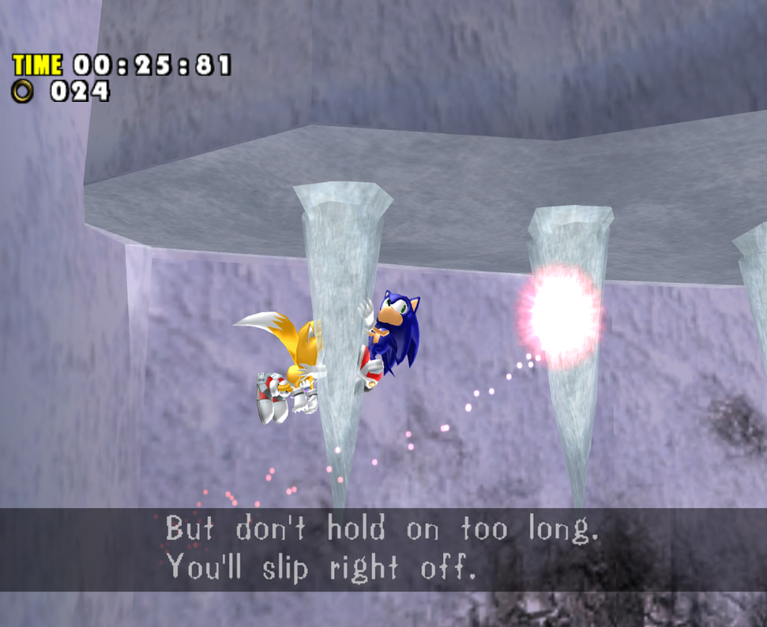 Sonic and Tails climbing on icicles, from Sonic Adventure DX: Director's Cut .
