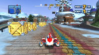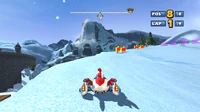 The conventional path contains an item and ends with a ramp on which the player can do tricks to receive a boost. However, there is a pit on the left-hand side which will kill the player. After the jump, the player must navigate a series of gradual turns. At the end of the course, the player has the option of using a ramp to gain a boost. The downside to this is the abyss on the left side, should the player not be careful. Just before the finish line is a straight section of track. Giant eggs roll down chutes on either side of the track, and can cost the player the lead.