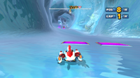 As its name suggests, this course is set in an icy valley around a mountain. It is a fairly simple course with plenty of gradual turns near the end of the track. At the start of the race, the player has the choice of either making a left turn, which would take him on the normal course, or barreling through some turning signs in front of a cave. Should the player choose the latter, he will take a path straight through the mountain. This path has several boost panels.