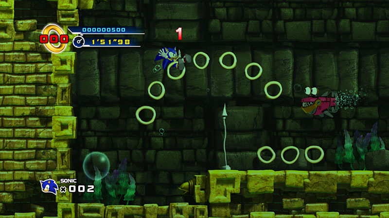 In the 16-bit version of the original Sonic the Hedgehog, the Jawses[2] (プクプク[3],Pukupuku?, lit. "Puku-Puku") are found in the underwater sections of Labyrinth Zone and Scrap Brain Zone Act 3. Since Jawses can only swim back and forth without deploying any direct means of offense in gameplay, they can easily be destroyed with a Spin Attack-related attack. Upon their defeat, they release an Animal and grant the player 100 points.