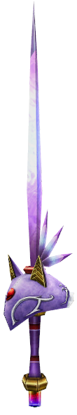 Joyeuse is a highly stylized rapier -type sword. It has a lavender grip with red rings and a rose-lavender sword pummel with a thick golden ring. It also has a cup hilt in the shape of Percival's/Blaze 's forehead with her hairband and ponytail behind the blade, and is decorated with white swirling lines. The sword's thin blade is white and lavender with the midsection bulging out very slightly.