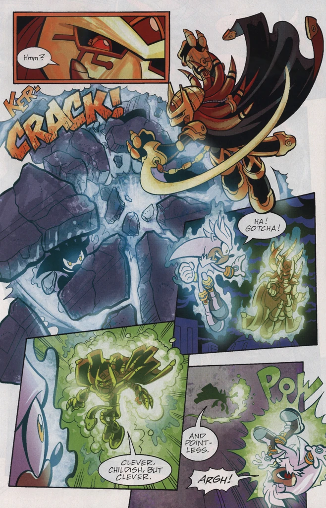Charging at each other, Silver, in a rage, threw large pieces of rubble at Enerjak, who easily disintegrated them. Asking if it was his turn now, Enerjak resumed his charge at Silver, who then used his powers to throw him through the face of his statue and off of Angel Island. Remarking that he was rather fond of the statue, Enerjak said that throwing him was nothing compared to him hitting Silver with the island, which he then did, much to Silver's shock. Enerjak then proceeded to summon an army of Prelates, which nearly overwhelmed Silver had it not been for Jani-Ca coming to his rescue. With Jani-Ca fighting the Prelates, Silver turned his attention back to Enerjak. Enerjak would then be trapped by Silver in a psychokinetic bubble and be dragged across the entire island by him before Silver would throw him at the island itself. Though Silver assumed that he had killed him, Enerjak would unexpectedly reappear behind him and remark how "rude" it was of Silver to scuff his helmet. Enerjak would then throw Silver against the pavement and mock him for not being powerful or skilled enough to stand against him. As Enerjak was about to strike the final blow, Silver, recalling a number things he was told by Mammoth Mogul and Edmund, realized that he would be unable to match Enerjak in power and instead began using his psychokinesis to redirect Enerjak's chaos energy blasts back him.[9]