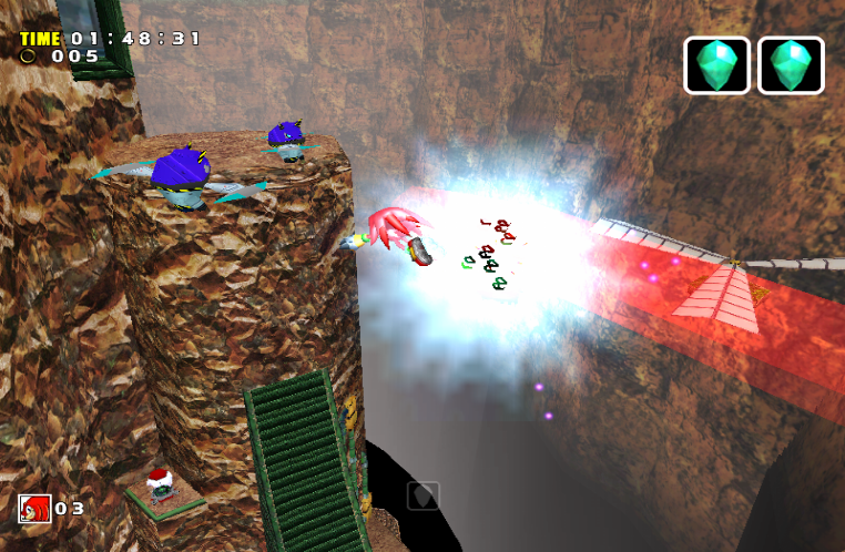 Once near one or more enemies, the player must release the Action button. Knuckles will then release the stored power and unleash a chain of attacks, gliding into all nearby enemies at high speed and destroy them. Just like Light Speed Attack , Knuckles leaves a glowing trail behind him with small purple orbs when blasting through the enemies. Using this attack on Chaos 6 will also deal double damage.