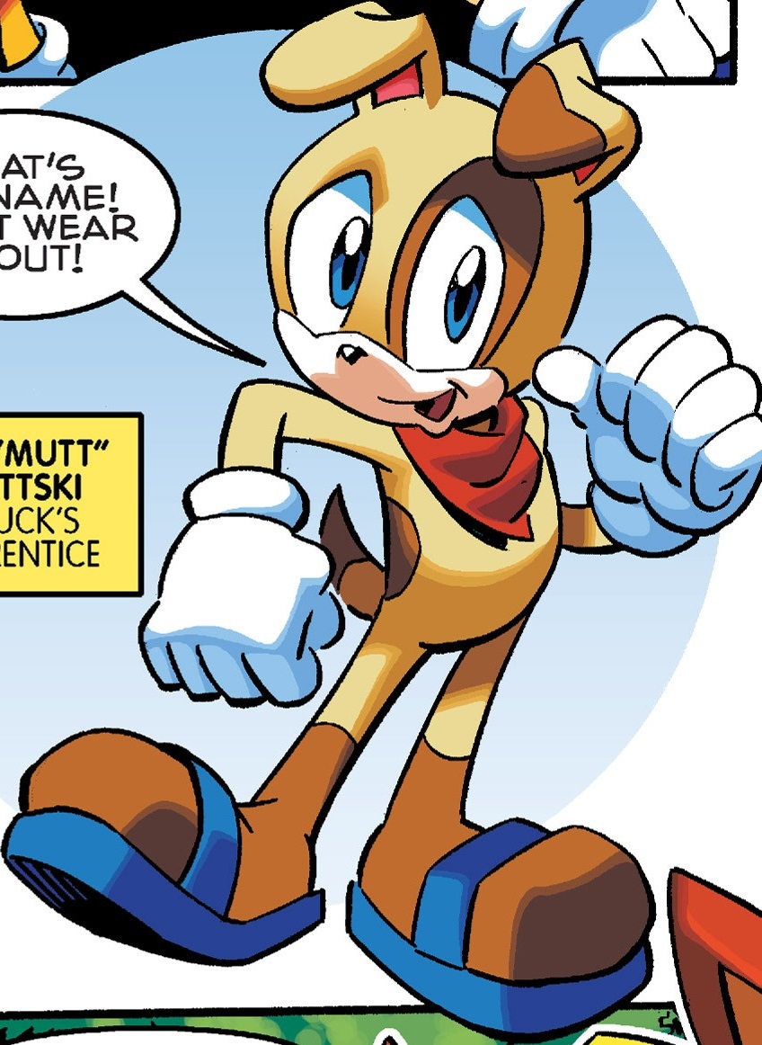 In the Sonic the Hedgehog comic series and its spin-offs published by Archie Comics, Muttski was originally Sonic the Hedgehog's pet mobini dog. After Robotnik's coup d'état, Muttski was among the many residents of Old Mobotropolis who got captured and roboticized. Now turned into a mindless slave, Muttski became one of Sonic's most dangerous enemies early on. Eventually though, Sonic and co. managed to restore Muttski's free will. Later, thanks to the Bem, Muttski was fully deroboticized and returned to being Sonic's normal pet.