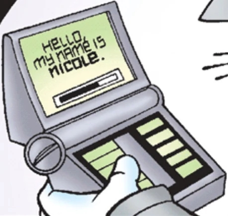Nicole[1] is a character that appears in the Sonic the Hedgehog comic series and its spin-offs published by Archie Comics. She is a hand-held computer from the Discovery Zone, and a friend to that universe's Sally Acorn.[1]