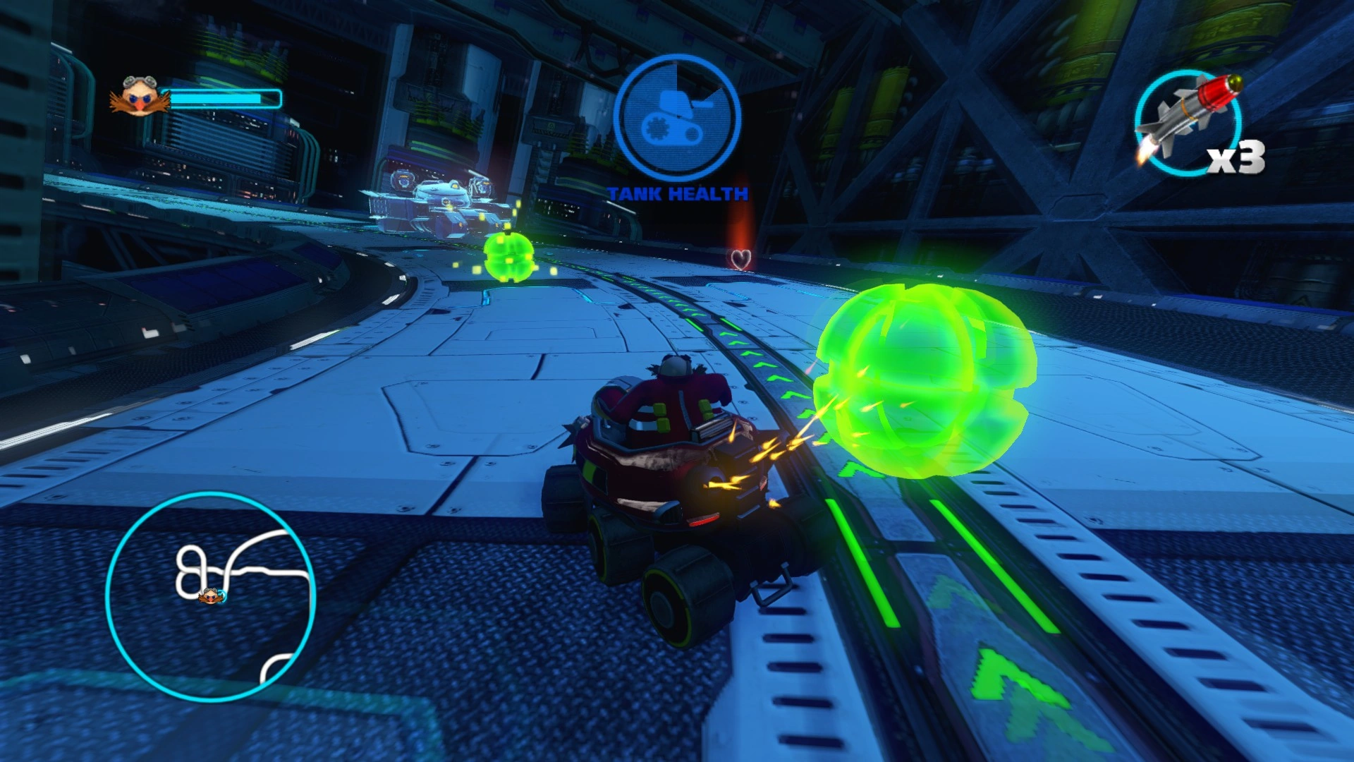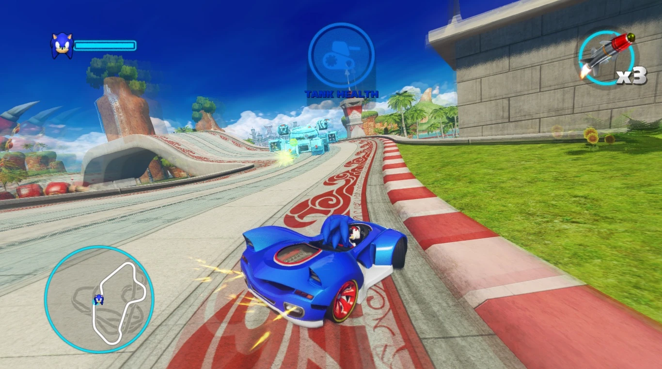 At the same time, the tank can launch its own attacks at the playable character. It is best that the player avoids these attacks, as they have their own Health Gauge to worry about; for every attack from the tank that connects with the playable character, the energy bar in the player's Health Gauge will decrease. If the player's health gauge empties completely, they will be eliminated and the player will fail the event. As a remedy for that, the player can restore some of their Health Gauge by collecting hearts that are placed on the race track. The tank's own durability is displayed by the circular Health Gauge on top of the screen's HUD. This Health Gauge will decrease every time the tank gets shot by the player. After receiving a certain amount of damage however, the tank will start to short circuit before changing its attack pattern. In order to win the Pursuit event, the player must empty the tank's Health Gauge, which will lead to its destruction.