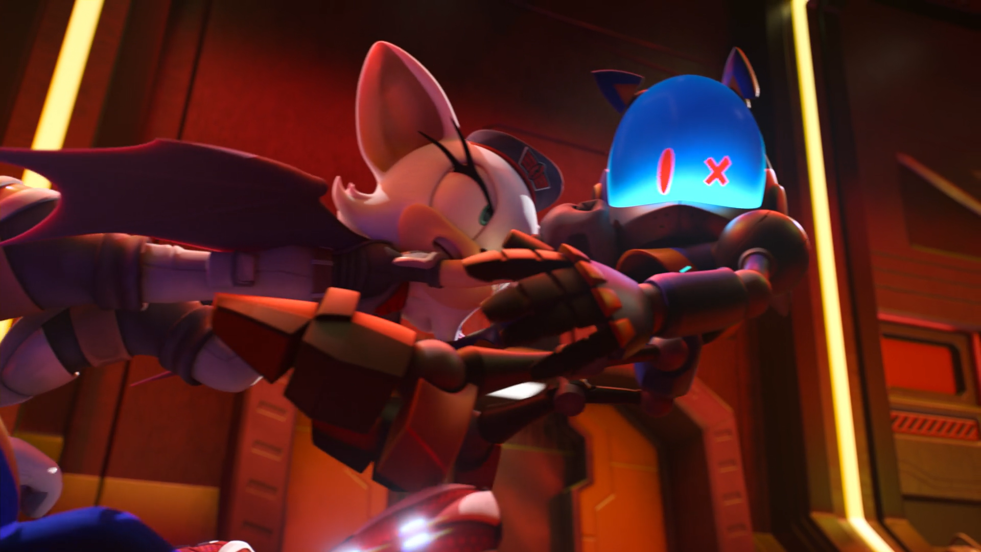 Rebel and Renegade started watching Sonic the Hedgehog the moment he arrived. Upon realizing he has hope for a better future and he knows Green Hill, Rebel saw Sonic as a potential ally. Later, Rebel and Renegade witnessed Sonic and Nine getting captured. Trying to get them back, Rebel suggests to Knucks that they need to infiltrate the Council's base. Luckily for them, the city suffers a massive power letdown. They take advantage of that to get into the base. Rebel and Knucks rescue Sonic and fight against Rusty Rose.