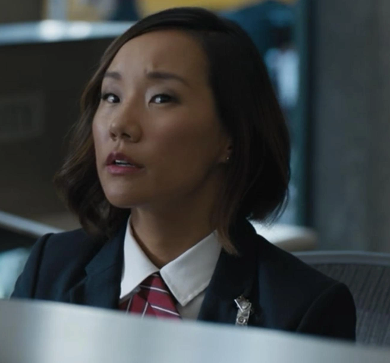 The receptionist is a female human-being with peach skin, brown hair and eyes. For attire, she wears a dark pale blue suit, with a white shirt underneath. Around her collar, she wears a white-striped red tie.