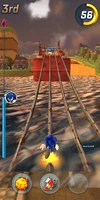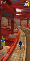 The racers begin by running up a small hill, and will quickly come across the first of many areas of the track that contains two lanes of short Grind Rails with spikes , Rings, and enemies placed directly on them. The racers then must navigate around a large number of obstacles, which holds true on Grind Rails and throughout most of the track. There are several splits in the track; one of which goes under the upper pathway on two Grind Rails, while the upper path continues and has several obstacles, but is more direct. Another is at the end of a backward-facing Conveyor Belt , and racers must quickly go to the left directly at the end of it from the main path if they wish to take it. The finish line can be found beyond sets of alternating ground and Grind Rails, and a series of hurdles and Item Boxes in the racers' paths.