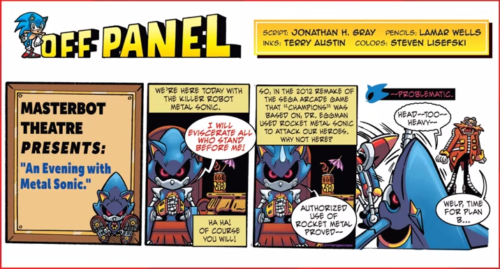 Rocket Metal Sonic made an appearance in the Off Panel from the Sonic the Hedgehog #271 published by Archie Comics, where it was explained that he did not appear in the "Champion" story line because its heavy head made it impossible for it to move.
