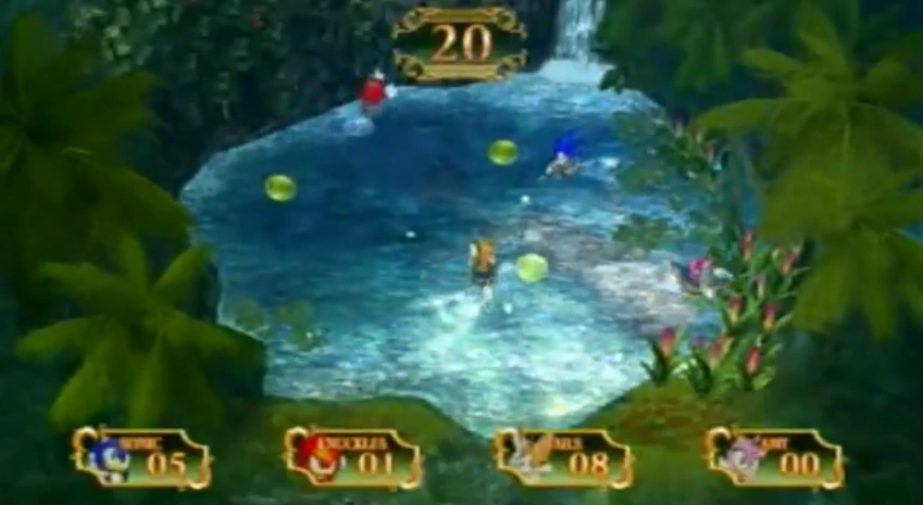 Each player is sitting in a canoe which is in the center of a circular lake. Once the game starts, golden medals drop from the sky onto the surface of the lake. While the medals float on the lake, the player must collect them by touching them with his or her canoe. However, if no one collects them within a certain amount of time, they disappear. Collecting a small medal awards the player one point; collecting a large medal awards the player three points. The player with the most points at the end of the time limit wins.
