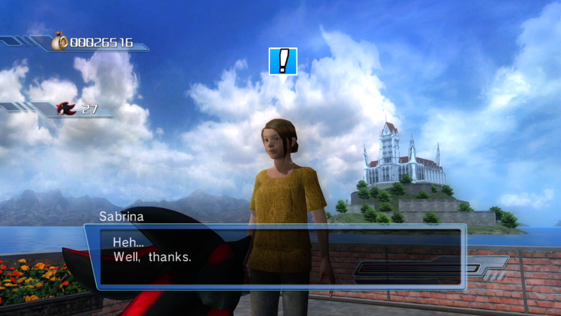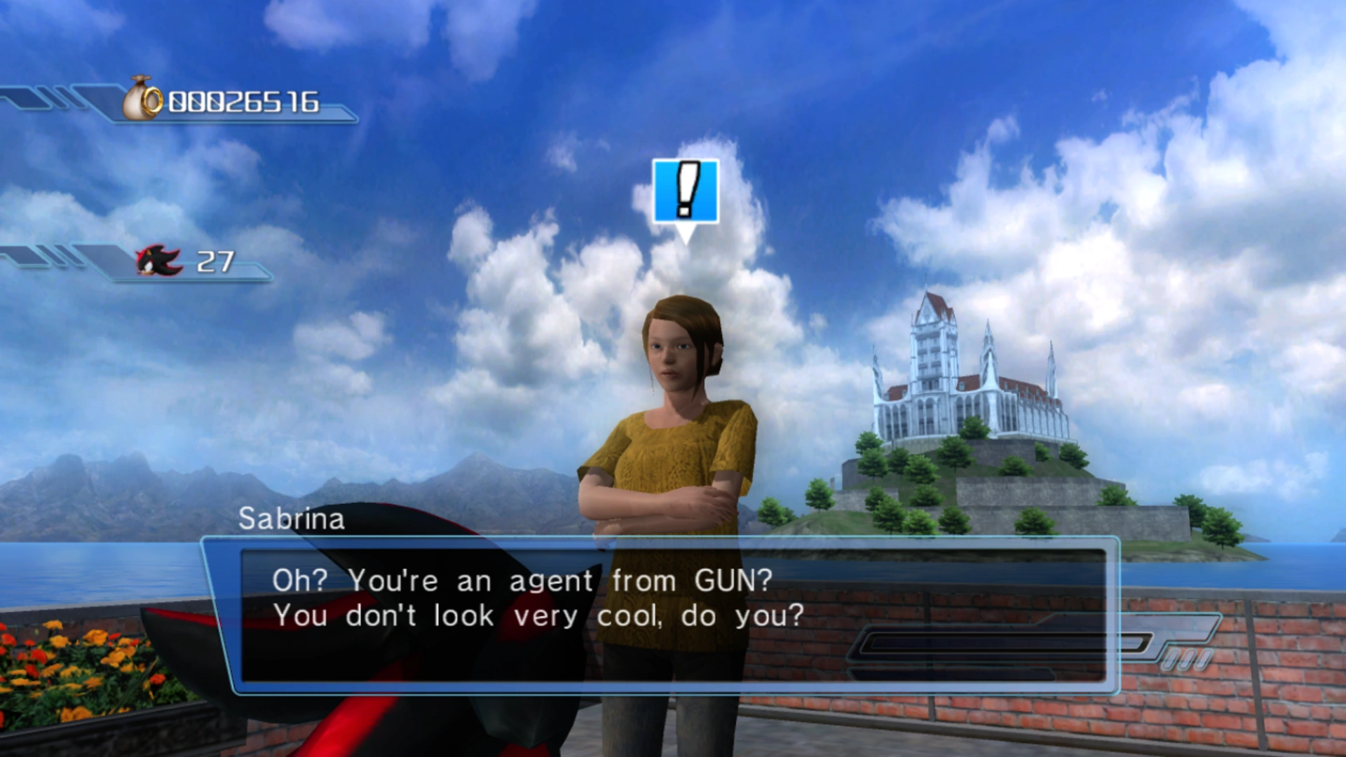 In Shadow 's story, Sabrina plays the largest role in Shadow's twelfth Town Mission . In Soleanna Castle Town , a G.U.N. soldier reports to Shadow that Dr. Eggman has targeted Lord Regis in what may be an assassination attempt, and that his daughter could also be in danger. The soldier gives Shadow an assignment: he must become Sabrina's personal bodyguard and protect her from the hostility of Badniks , in addition to carrying out her orders. This is only a temporary job until another G.U.N. agent arrives to take his place.