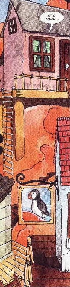 Houses in the town are built on the side of a steep rockface. Captain Plunder has a shack in Scourge Bay where he keeps valuable possessions including, at one time, a chest containing numerous ancient documents about the Floating Island.[1]