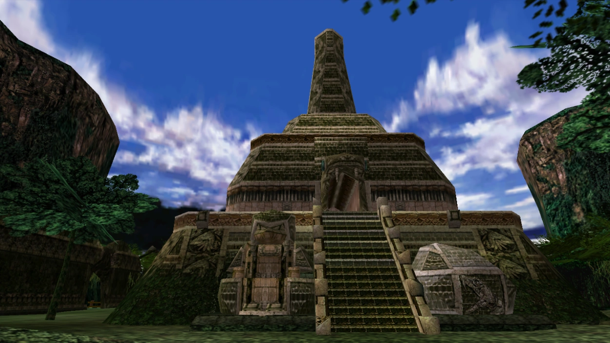The shrine is pyramid-like structure consisting of four thick platforms stacked on top of one another and a staircase on each side leading up to the upper levels. The shrine features two entrances on the top level on the front and back, with the door openings in the shape of a serpent's head. Inside the shrine is an abandoned subterranean world, dubbed the Lost World, which consist of a labyrinth of passages, large water streams, secret inflamed traps, mystical machines like the Lit Panel, switches that determine the water level of rooms, moving snake-shaped panels, darken rooms with bottomless pits, and a system of light reflection-based puzzles.