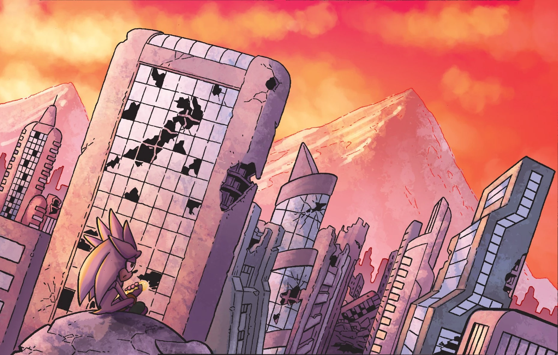 Silver overlooks the ruins of a city in 3437 P.X.E., from Sonic the Hedgehog #215.