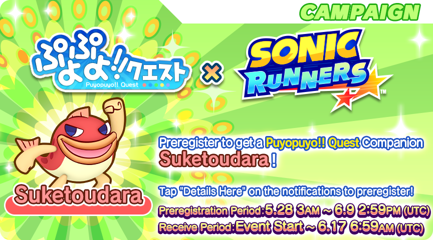 An Event that started on 10 June 2015 and featured a crossover with the Puyo Puyo series. This Event introduced a Puyopuyo!! Quest themed Special Stage. Here, the player can collect Puyo Coins to climb up the rankings, unlock prizes, obtain rewards and much more. The Event also introduces Amy Rose dressed up as Amitie, dubbed "Amitie-Style Amy", as a new playable character and as well the trio of Purple Papurisu, Suketoudara and Carbuncle as new buddies. The player can get Amitie-Style Amy, Purple Papurisu and Suketoudara on the Premium Roulette and Carbuncle by collecting enough Puyo Coins. The Event ended on 17 June 2015.