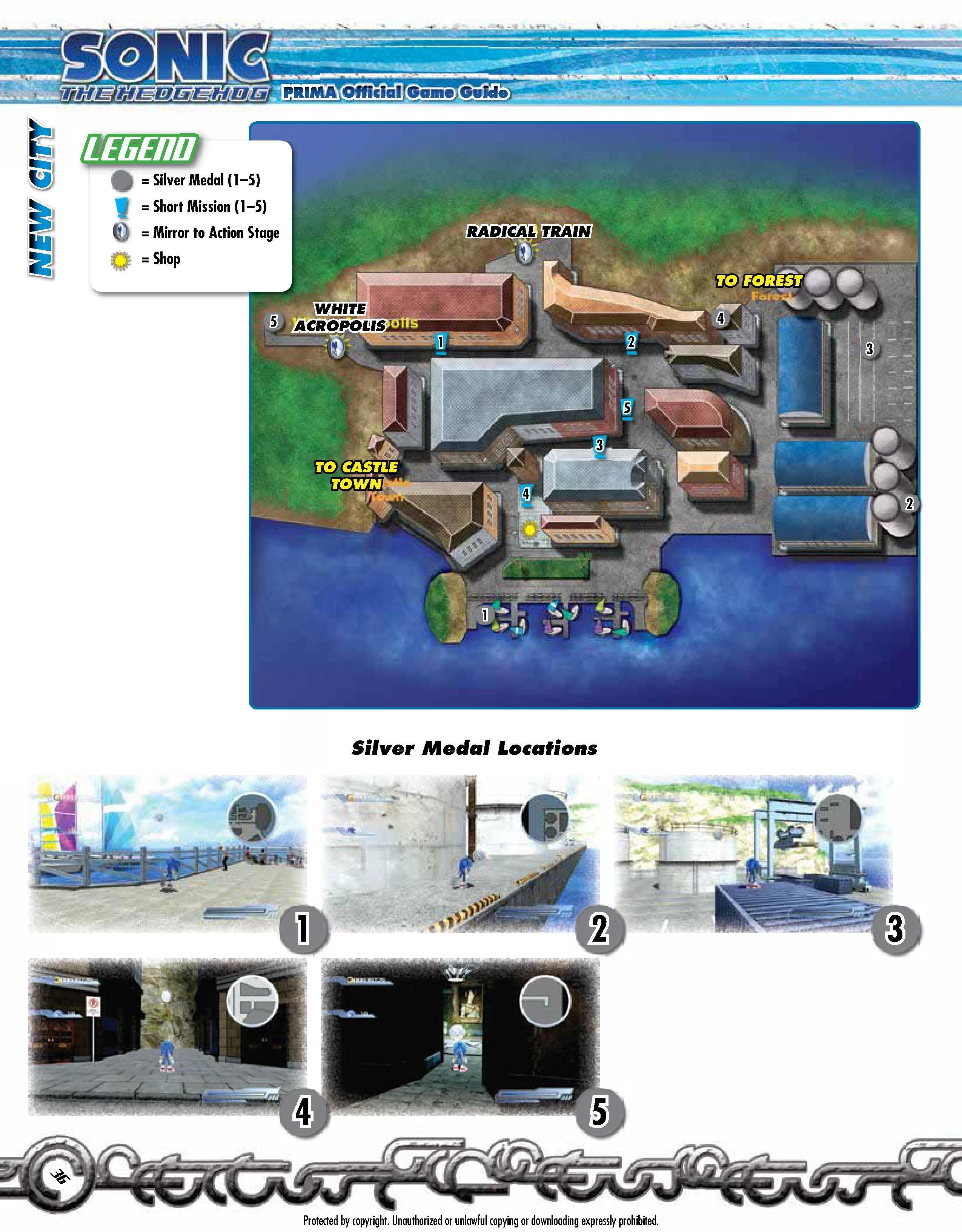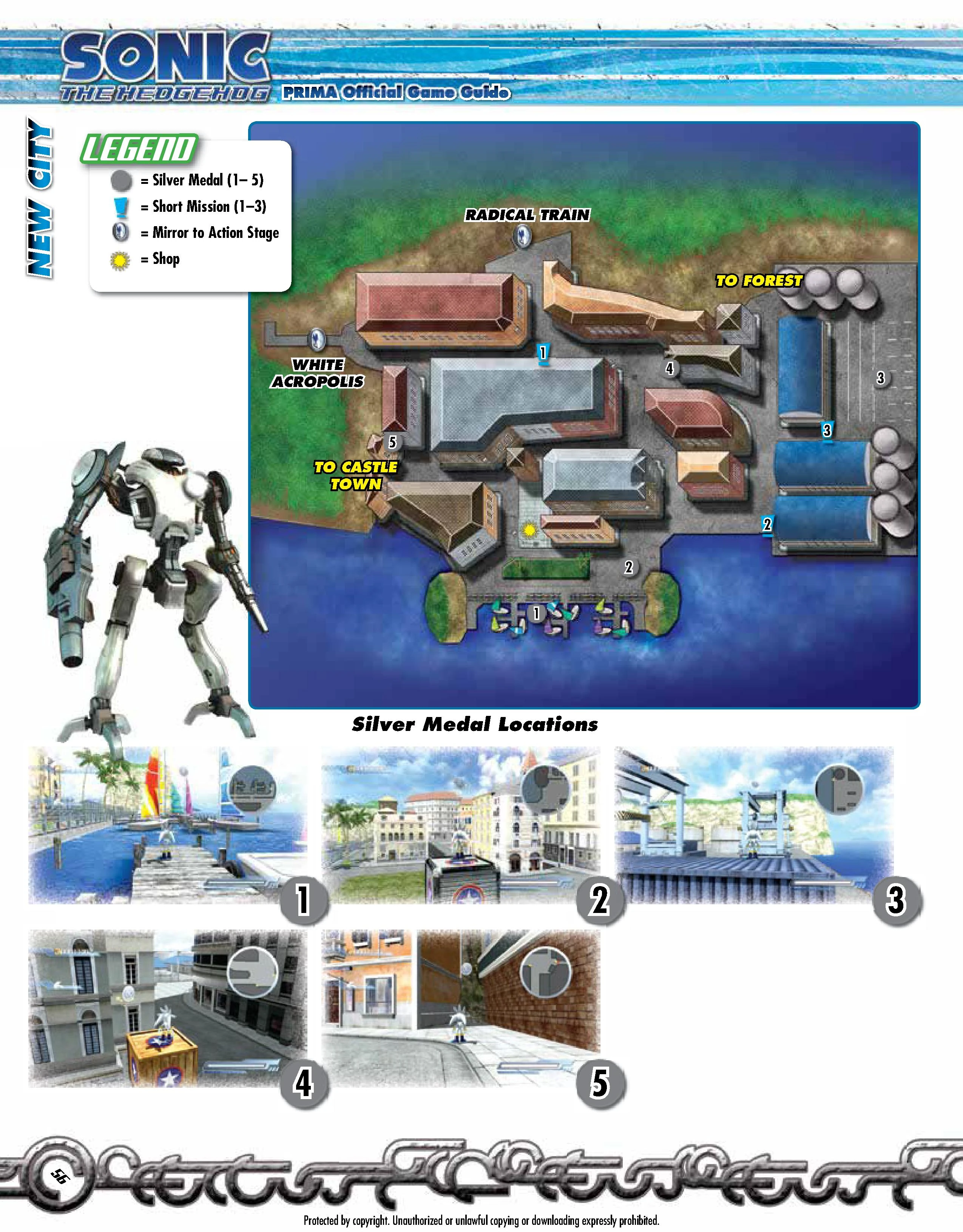 Soleanna New City is a modern city area, with taller buildings, a warehouse district, a train station, and for certain side missions it is shown to have a Highway section (that does not appear in the actual field itself). It also has a cave at one point that leads to a secret room with an unknown purpose (the same room that Shadow and Rouge enter after completing their version of Kingdom Valley). Silver reaches it after his version of White Acropolis and Sonic reaches it once he is told that Knuckles wants to meet him at the Warehouse area. It is also where, after Silver completes his version of White Acropolis and his fight with the Genesis, one can speak with Hatsun the Pigeon. Other times this part of the town of Soleanna was shown was when Silver questioned whether it was right to kill one person to save the world. This scene then leads to their second (and last) talk with the true villain. It also was used in the scene where Sonic, Tails, and Knuckles returned from Flame Core to notice that Shadow and Rouge were not with them, and when Rouge returned from the same area to see that Shadow had not come back with her. It is also the area where Amy takes Elise to after rescuing her from the Egg Carrier and where they have their conversation about love (during which they both fail to know they are actually talking about the same person).