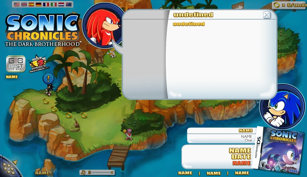 The player controls Sonic , who can interact with the characters and the environment in order to read character bios, trailers, story tidbits, etc. In this game, Sonic will automatically follow the cursor. which is a virtual Nintendo DS stylus for the mouse. Sonic can also collect Rings in order to unlock hidden media, and is able to visit Green Hill Zone and Voxai Colony Beta . The game has 75 Rings in total hidden around the two environments (some of which are hidden behind scenery in the areas). Obtaining enough Rings will grant the player two wallpapers as rewards, as well as a set of icons that are granted when all the Rings are collected.