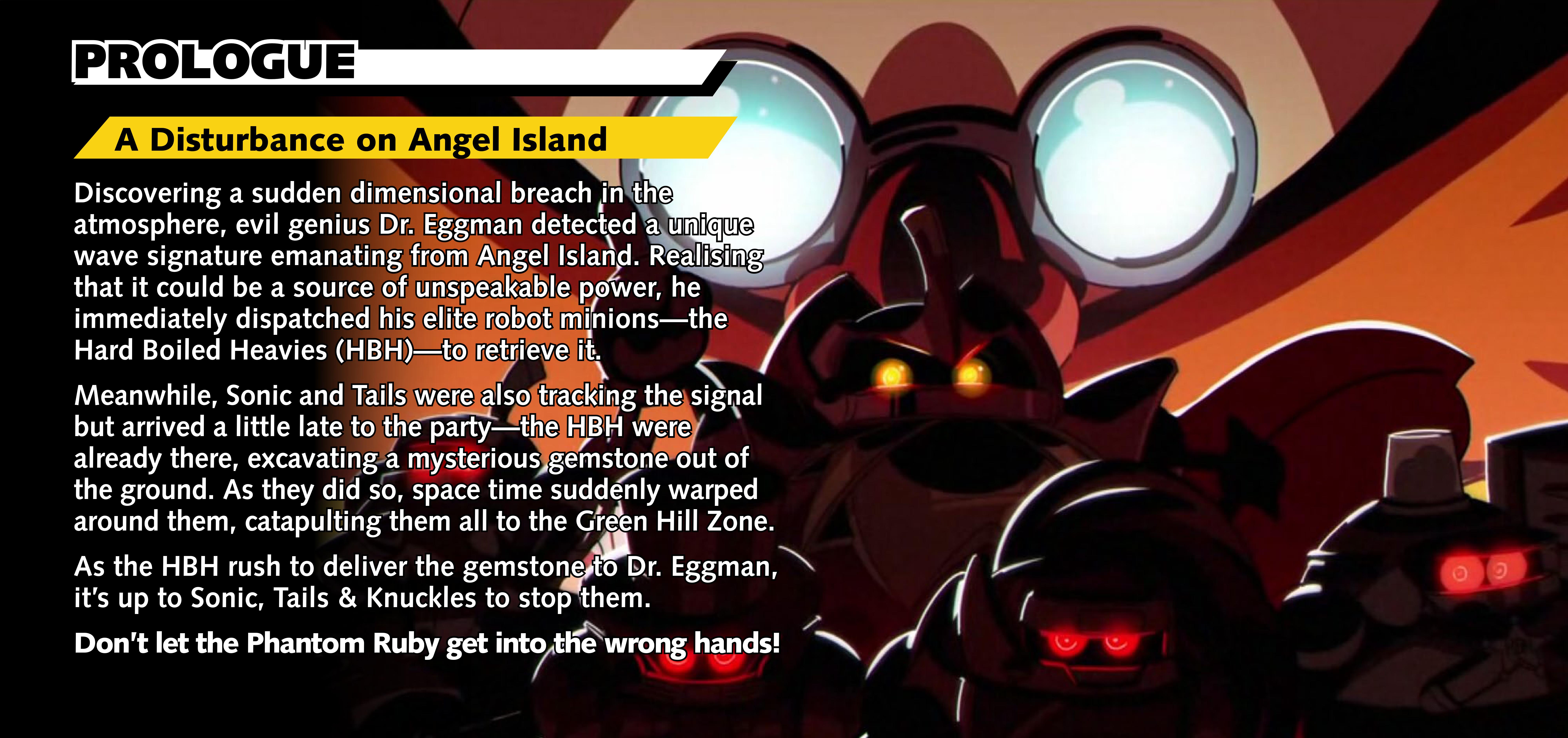 Sonic and Tails arrive on Angel Island just as the Hard Boiled Heavies excavate the source of the signal, a mysterious gemstone known as the "Phantom Ruby", from the ground. As they did so, space-time suddenly warped around them,[17] with Sonic, Tails, the Hard Boiled Heavies, and Knuckles the Echidna, who was relaxing nearby, getting caught in the warp. The group gets catapulted to the Green Hill Zone, where it is revealed that the Phantom Ruby's power has transformed the Hard Boiled Heavies into more powerful Egg-Robos and granted them free will. As the Hard Boiled Heavies rush to get away from the three, Sonic, Tails and Knuckles join forces to stop them. However, they are too late to prevent Eggman from stealing the gemstone from the now-rebellious Heavies, which he promptly uses to send Sonic and co. away. Not set back by this, Sonic and his friends continue to pursue Eggman to keep him from using the gemstone's power for evil, clashing with him and the members of the Hard Boiled Heavies along the way.
