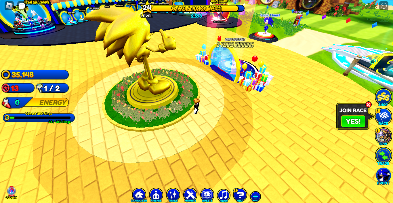 There is also an in-game Shop, where the player can buy stuff such as game passes, which help boost stuff such as rings, EXP or Magnet, or can give buffs like 2 more pet slots or an infinite magnet which draws everything closer to you forever, with a setting to turn it off. There are also passes that can give you double the levels, double the Skill Pieces, a pass that can allow you to open 3 eggs at once at a vending machine and a pass that gives you all the music that is in the game. In addition, the player can purchase Sonic-themed accessories and clothing (commonly known as UGC) for their Roblox avatar in a shop nearby the starting point in Green Hill. This stand is near the dock where Big fishes.