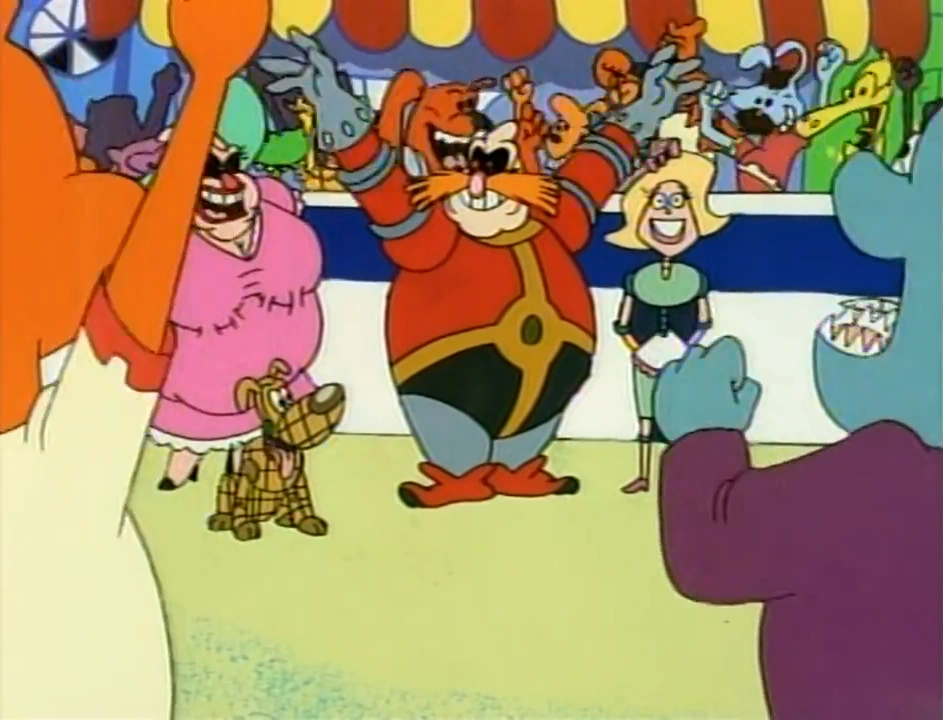 - Despite Momma Robotnik physically lacking her mustache in this episode, a still on live TV depicts her with her mustache hitting Robotnik with her handbag when Chollie Chang is reporting that Robotnik's popularity is plunging.