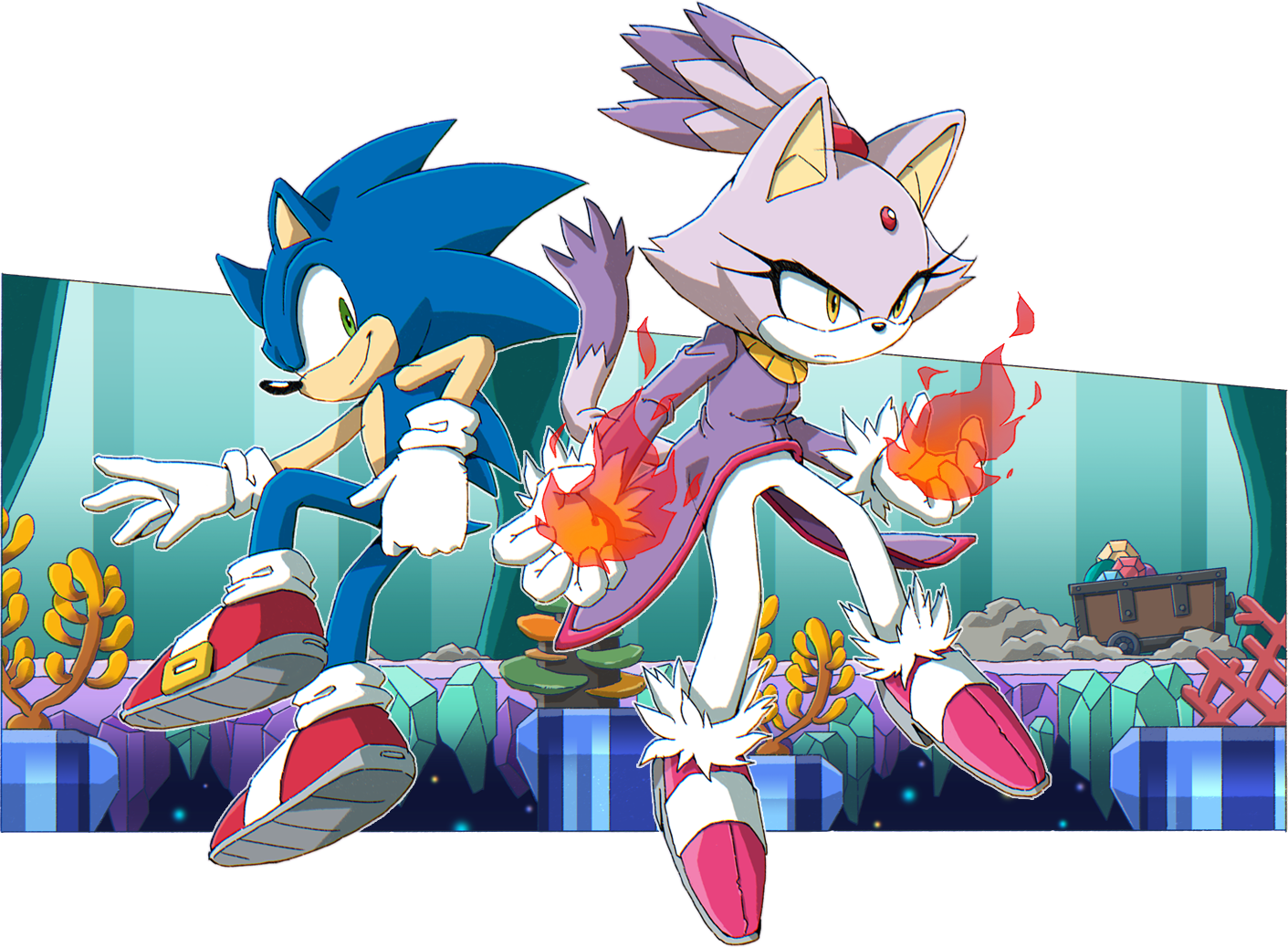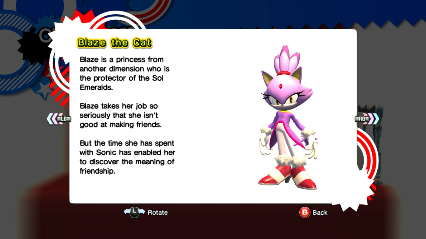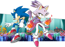 - ↑ 149.0 149.1 149.2 149.3 149.4 Sonic Team, Dimps (15 November 2005). Sonic Rush. Nintendo DS. Sega. Area/Level: Dead Line (Blaze). "Sonic: Hey, not bad. / Blaze: I... I must save the Sol Emeralds. I must.../ Sonic: A bit overzealous, aren't we? (But it seems like she's had a rough past.) Hey, don't bite off more than you can chew. And be yourself. Don't need to do everything on your own. / Cream: Blaze! / Blaze: ... ... ... Perhaps... Perhaps you're right. I can rely on friends, if I let myself... / Sonic: Great! I am Sonic. Sonic the Hedgehog. It's nice to meet you. / Blaze: I-I'm Blaze. It's nice to meet you too."