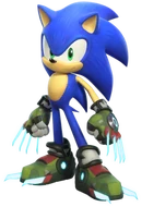 Sonic was then scanned by Nine to see the problem, in which the former was taken by him to his lab so that the young fox inventor could fix the problem. Once Sonic arrived, Nine presented a set of Regulators to him in order for the strange energy to be attuned. Once equipped, however, his gloves and shoes started to glow, transforming into special pairs of gloves and shoes instead. Sonic was quite amazed to see the new pairs he has gotten from the Regulators, in which he thanks Nine. Once they got out, Nine told him to be quiet to not be noticed by anything, in which the latter ignores, eventually being grabbed by Dr. Babble.[2] While Dr. Babble carried them back to the Council, Nine and Sonic then have a small banter about keeping quiet.