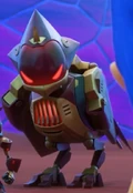 After Sonic explored this new location, he noticed his shoes' soles were glowing and emitting electricity off of them. He then asked the locals where he exactly was but was irritated to see they were ignoring him. Confused as to why everything is so soulless and lifeless, he noticed different versions of Big and Froggy in sight, whom he mistook for their counterparts from his universe and questioned the clothing they were wearing. However, when the hedgehog attempted to talk to them, a Security Drone went on alert after seeing him due to him being "an unidentified citizen". Finding himself cornered by Eggforcers, who ordered him to stand down or else be eliminated under the order of the "Chaos Council", Sonic ran off, but struggled to maintain balance due to his shoes. As he fought these robots, he noticed certain parts of Green Hill were here, albeit heavily distorted. Remembering the previous events, and how Eggman planned to get the Paradox Prism, Sonic believed that his nemesis might have won. As such, he rushed off to find Tails.[2]