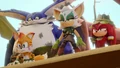After remembering Shadow, Sonic wakes up. Tired, Sonic asks if he passed the tests. The Council prepares to kill Sonic and extract his “weird energy”. In response, Sonic asks if he could say his final words. Sonic then attempts to come up with a speech about his friends and his life. During the speech, he looks at Nine and assumes that he's winking, leading him to believe that the fox has a plan. Afterwards, Nine mentions that there was just dust in his eye, and he wasn't actually winking. Nervous about his potential death, Sonic mutters that it’s “Game Over” for him. Fortunately, Rebel Rouge and Renegade Knucks save Sonic from the execution, then fight the Eggforcers and Rusty Rose. Sonic's cage spins around, causing him to be woozy. Nine deactivates Sonic's cage and notice the two rebels in front of him, Sonic assumes them as Rouge and Knuckles. Sonic then struggles to fight Eggforcers and Rusty Rose due to his dizziness. Before Rusty Rose can harm Sonic further, Nine manages to gain control of her, and uses her to destroy the other Eggforcers, temporarily turning her to the good side.