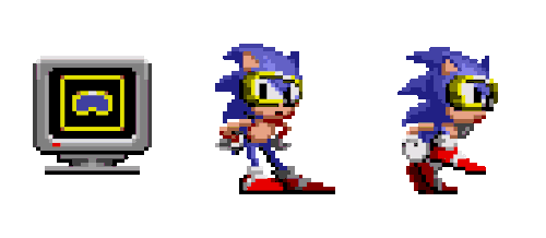 These unused set of sprites shows the use of a type of goggle power-up. It is unknown what the power-up would have done but it is likely they would have allowed Sonic to breathe underwater. Sources of this were found in the ROM data of the game and was added as an extra debug monitor in the 2013 remaster. |
