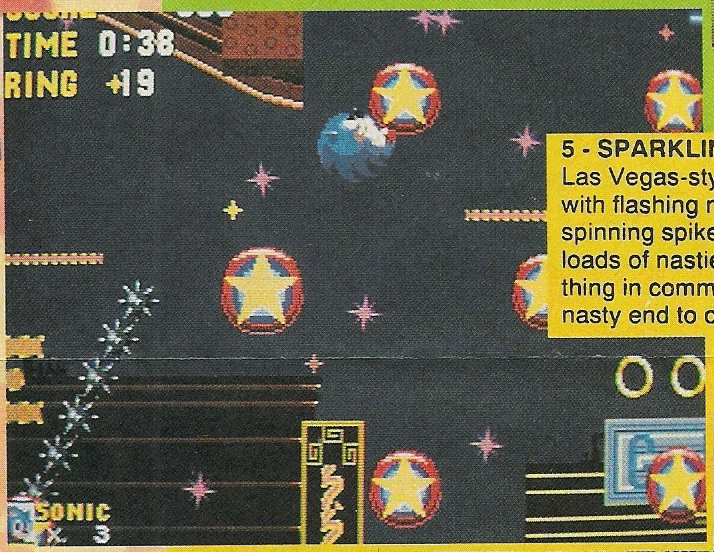 "Sparkling Zone" is an early version of what would later be known as Spring Yard Zone. It had a starry sky background and more of a focus on neon lights and signs with text. It was originally going to be the second to last zone in the game.