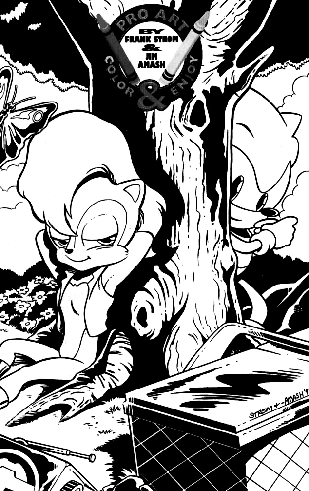 - Pro Art: Full page illustration of Sonic and Sally sitting on opposite sides of a tree during a picnic. Presented in black-and-white as a coloring page. Pencils by Frank Strom, inks by Jim Amash.