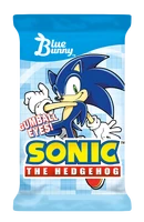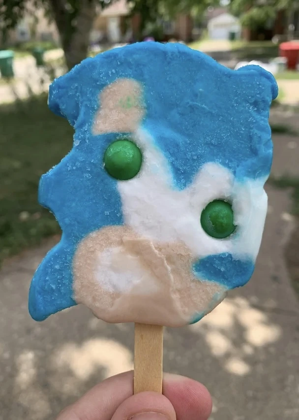 Shaped to resemble the blue blur, this ice cream bar features a combination of blue raspberry and cherry flavors, and originally had eye pupils which were two small black gumballs. This was changed in 2004 to green gumballs to match the character's more modern appearance since Sonic Adventure.