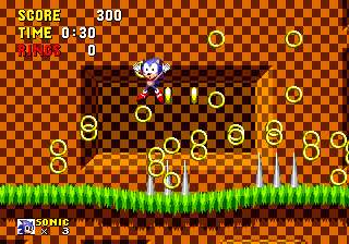 Sonic losing a life by spikes, from the 16-bit version of Sonic the Hedgehog (1991).