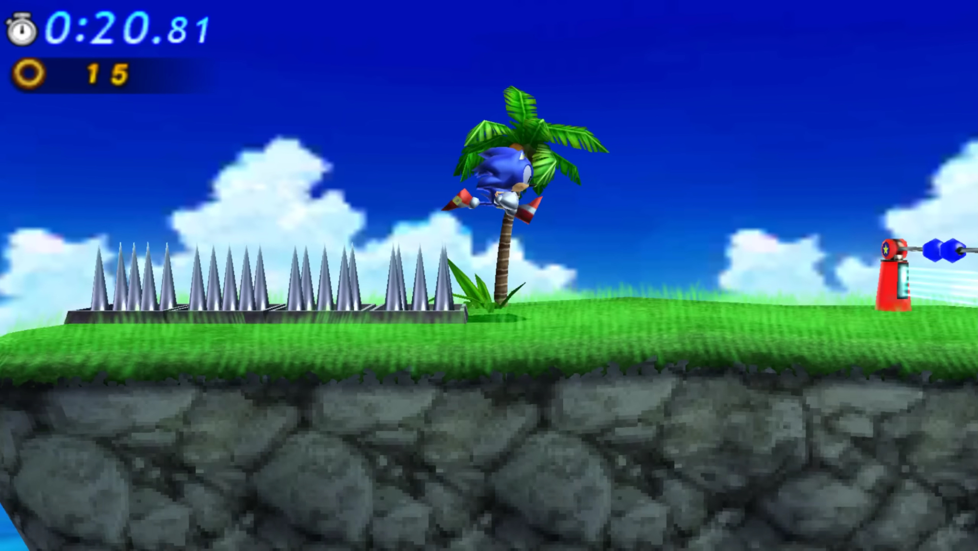 In this game, these conventional spikes only appear Green Hill. Because this stage is a 3D variation of the Zone from the original Sonic the Hedgehog, the spikes are located in positions similar to those in the original Zone.