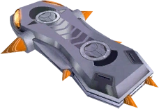 The Steel's design is like that of a rather typical, yet high-tech Extreme Gear. It has a board-like, yet sturdy looking shape, with sharp corners. It is mostly colored dark gray, with an accent in a lighter shade of gray encircling it on its outmost edges. It also has orange spikes on the accent on the outermost edges (two on the sides and two on the front), and circular pads on the top surface, decorated with different lines.