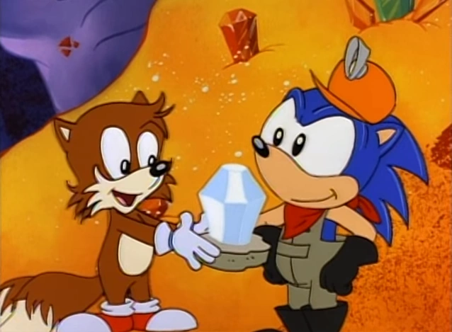 Sonic and Tails find a cave full of gold and diamonds. They also meet a mole named Spelunk who thinks they want his money. He tries to blast them with a cannonball, but they manage to avoid it. The cannonball ends up trashing Scratch and Grounder. Sonic and Tails come across minecart tracks which they assume will lead them out of the underground tunnels. They run along the tracks, but are stopped by an angry Spelunk coming straight at them in a minecart. Sonic and Tails try to outrun him when they notice a family of turtles crossing the tracks. Sonic dresses as a crossing guard and stops Spelunk, allowing the turtles to cross the track. Once the turtles are safe, Sonic lets Spelunk's minecart pass. He and Tails once again attempt to leave the tunnels.
