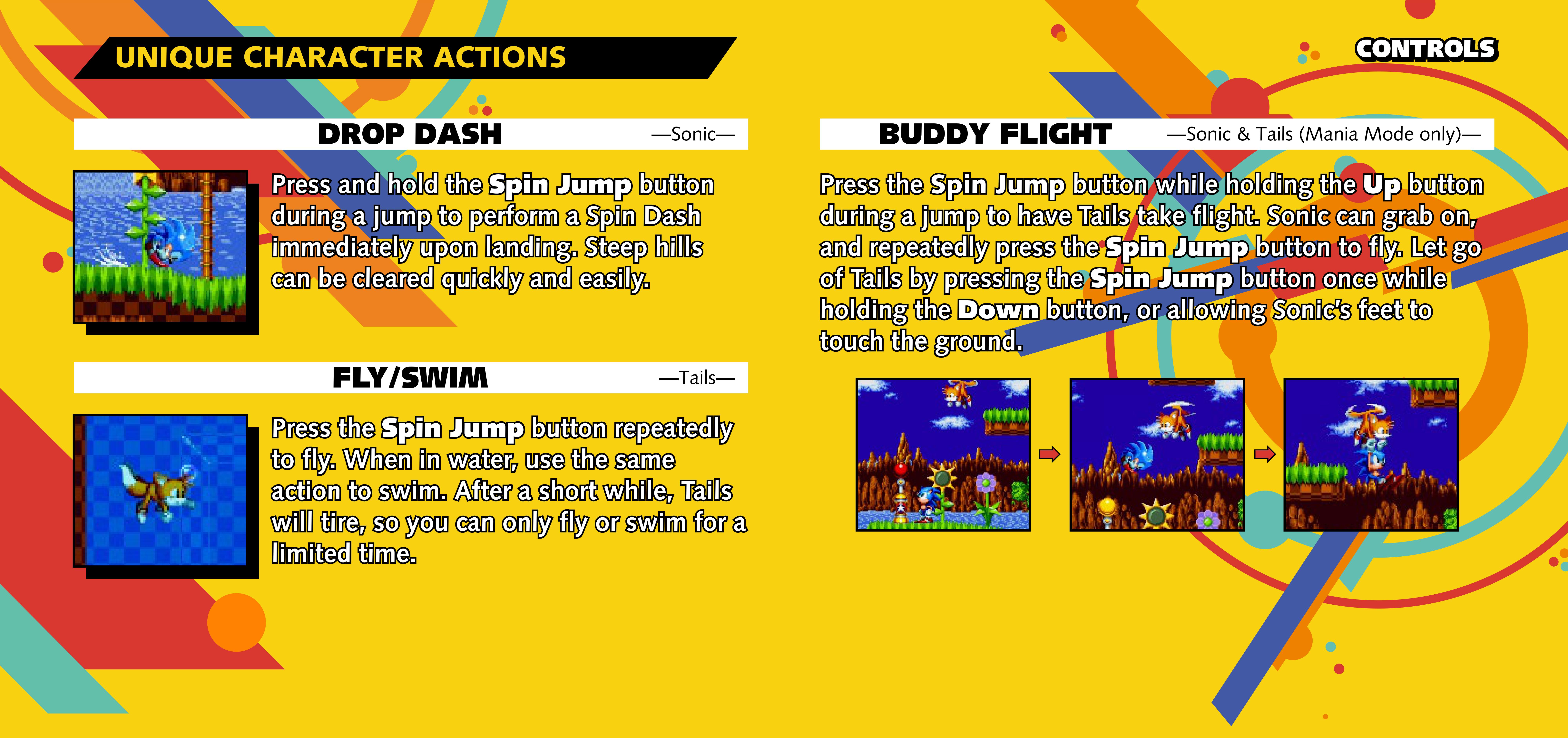 Air Glide ^ · Bounce Jump · Climb · Crouch · Double Jump · Drop Dash · Fireball Spin Dash · Glide · Hammer Drop ^ · Insta-Shield · Propeller Flying · Ring Spark Field · Spin Attack · Spin Dash · Spin Jump · Super Peel Out · Swim · V. Maximum Overdrive Attack