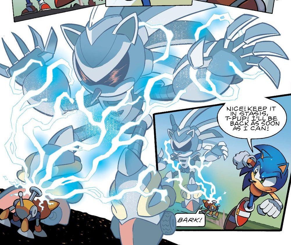 During Team Fighter's continued pursuit of Dr. Eggman in Feral Forest, T-Pup halted a rampaging Silver Sonic v3.0 with a built-in electrical force field and placed it in stasis, allowing Sonic to go after Mecha Sally and prevent her from killing Elias Acorn and his family.[11] It also served as a communications device to allow Team Fighters to warn New Mobotropolis of the Death Egg's approach.[12] It also assisted Tails in operating the Tornado and in accessing valuable information during their pursuit of the Death Egg towards Albion, during which it proved instrumental in stopping the Krudzu Hybrid Hydra/Titan Metal Sonic fusion.[13] Later, after the Tornado crash-landed in Albion, Tails left T-Pup behind to make repairs and synthesize fuel.[14] While in this process, T-Pup was menaced by a Tasmanian Devil, but Knuckles the Echidna arrived and came to its aid. Quickly taking a liking to the Guardian, T-Pup helped him locate Team Fighters, and afterwards was used to attempt communication with Angel Island-directly first, and then through the medium of Nicole back in New Mobotropolis.[15] After these unsuccessful efforts, T-Pup would return to the Tornado, which soon got under way with some help from Shard the Metal Sonic.[16]