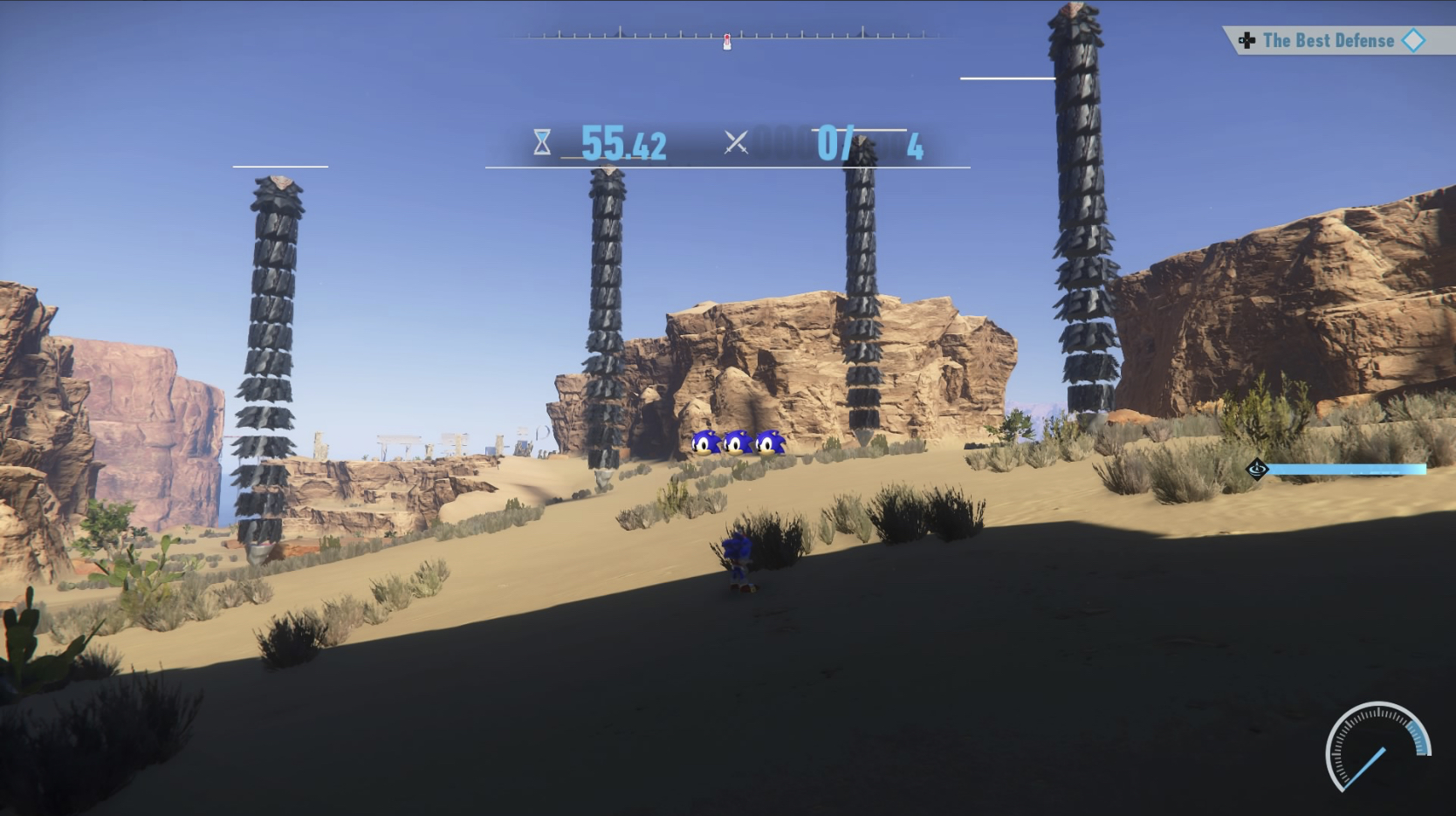 The Best Defense [ 1] is a Story Quest in Sonic Frontiers . It is the third and last Quest on Ares Island , as well the fifth Quest overall. It's hosted by Knuckles . Its goal is to defeat the four Towers before the timer runs out.