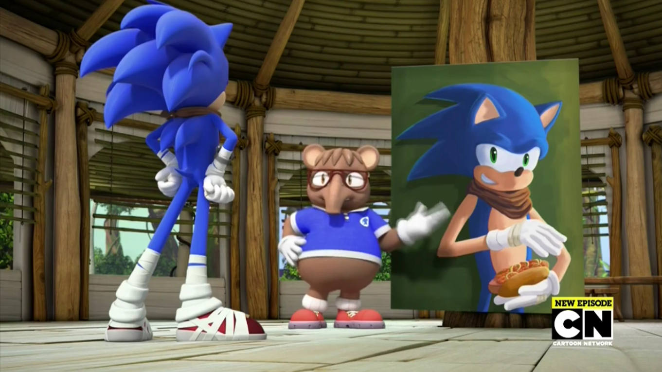 - The painting that Mark made of Sonic with beige-colored arms instead of blue is a nod to the mainstream version of Sonic who has beige-colored arms, and also to the fan's criticism of the blue arms that Sonic received as a part of his redesign for the Sonic Boom franchise.