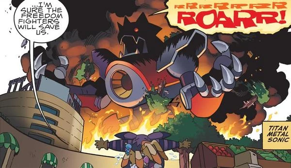 The first Titan Metal Sonic was produced by 3237. It was unleashed by Dr. Eggman from the Death Egg Mark 2 as a distraction along with Project "Deadly Cuddles". Known as Project "Titan", it almost destroyed New Mobotropolis, but was defeated by Ixis Naugus when he used his Crystalline Magic to turn the robot into the Crystal Golem. Naugus then used the Crystal Golem to block a blast from the Death Egg Mark 2's Egg Annihilator Beam, destroying the robot in the process.[2]