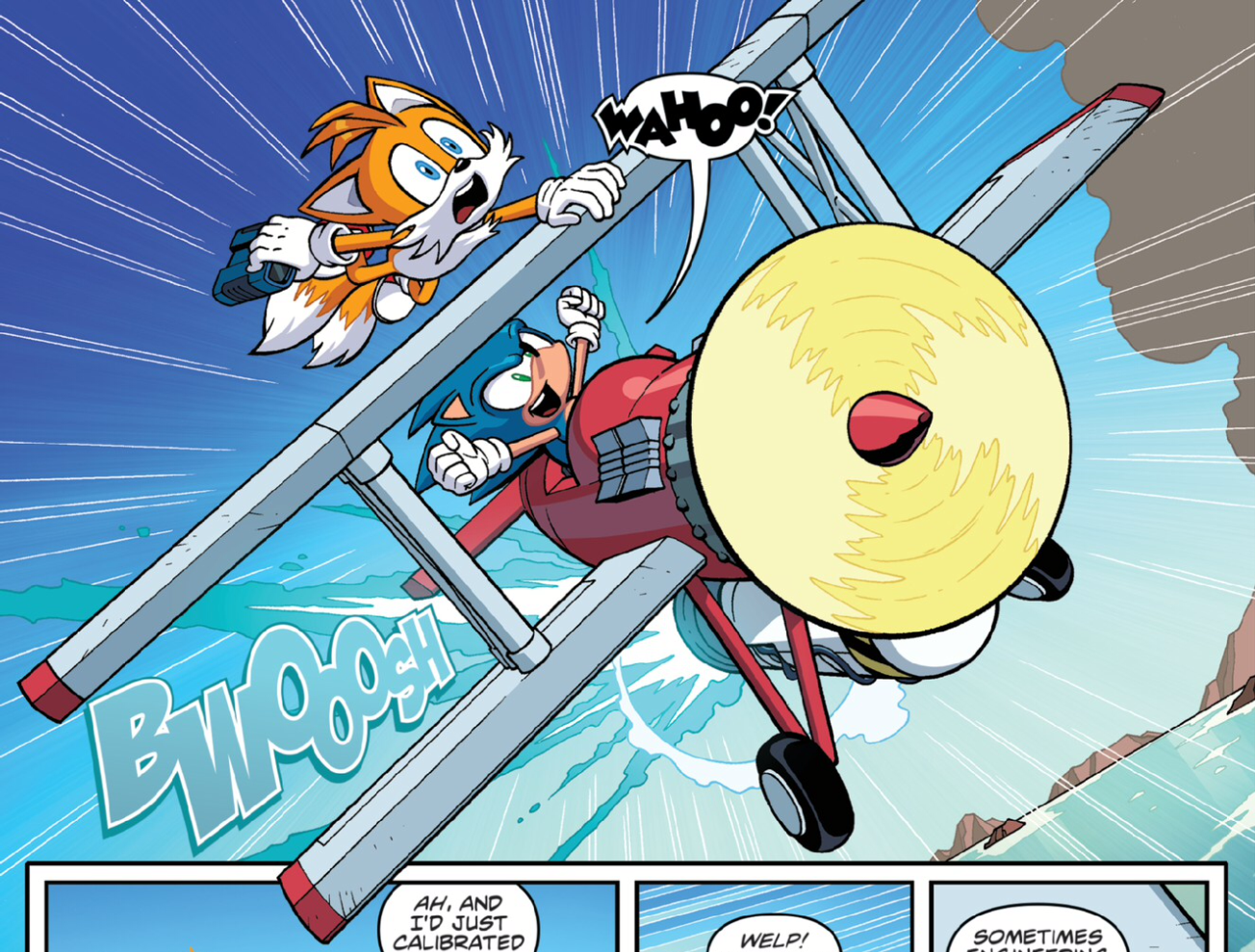 Sonic flying the Tornado with Tails onboard, from Sonic the Hedgehog Annual 2019.