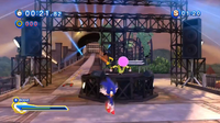 In this challenge, Sonic and Vector are standing on a rooftop that is decorated for a concert, with spotlights, loudspeakers and some small platforms surrounding them. Vector is standing on a stage in front of a keyboard. Vector will launch musical notes that Sonic must return to him by using an attack. Failing to hit a note in time will fail the Act immediately.