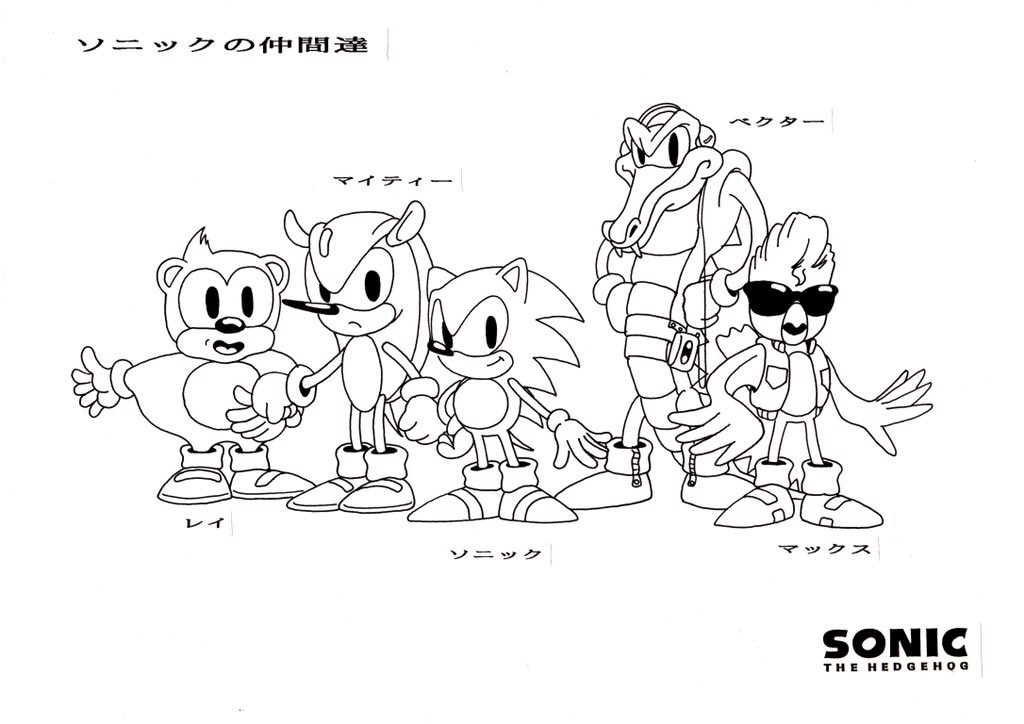 Concept art of Ray, Mighty, Sonic, Vector and a character named Max (a redesigned version of Sharps), illustrated by Naoto Ohshima.