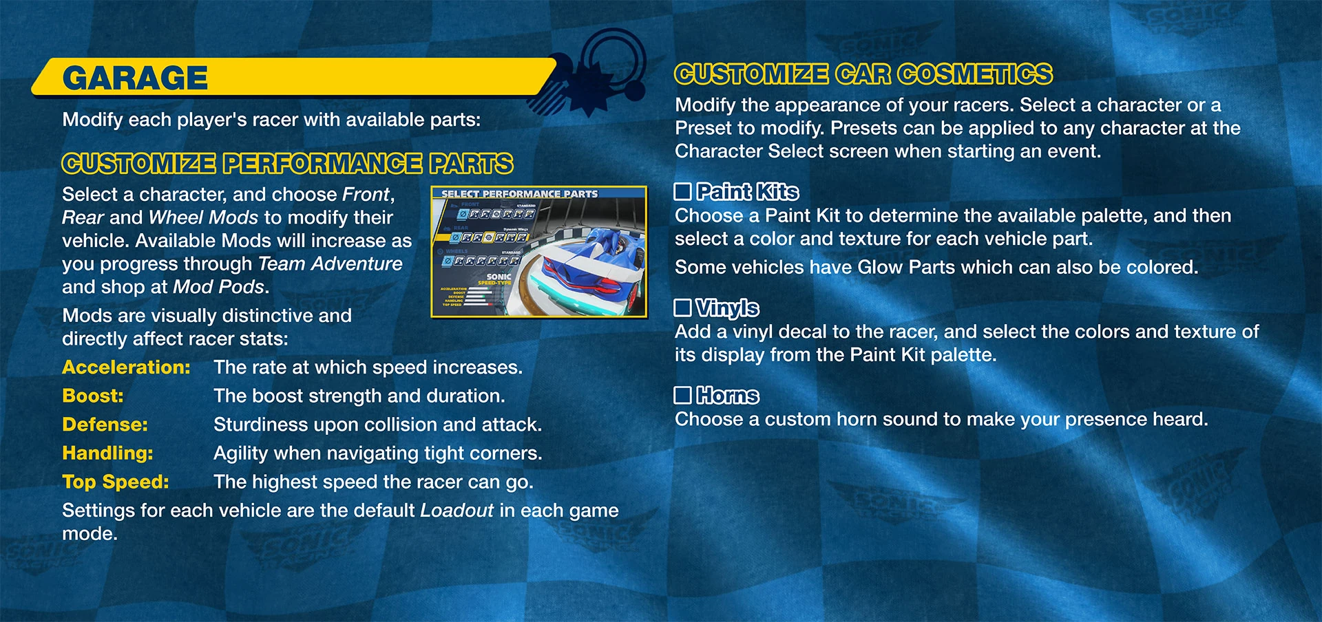 In Team Sonic Racing, Vinyls are Mods whose only purpose is to make aesthetic changes to a playable character's race car, meaning they have no impact on a race car's stats.