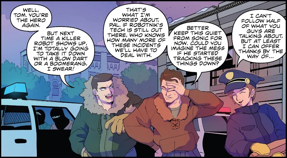 In Walla Walla, a group of bank robbers led by Jason attacked the first bank of Walla Walla in order to retrieve a Robotnik Control Glove and Dr. Robotnik's manifesto from the bank's deposit vault as a part of a job they had been hired for by Agent Stone. Thanks to their leader, Lindsey, who had infiltrated the bank, Jason found the Robotnik Control Glove and went to work activating it. Soon after though, Sonic came to Walla Walla to stop the robbery. When he met Lindsey however, she tricked him into the vault where she tasered him into unconsciousness. As Lindsey then updated Stone, they made a deal for them to deliver Sonic, whom they locked in the vault, to him. In the meantime, Tom Wachowski and Wade Whipple came down to the bank to assist the local police who had surrounded the bank. Soon after, Jason got some local Badniks to come and begin hauling the bank's vault away with the control glove. Seeing this awesome display, Lindsey and Jason decided to keep the glove for their benefits. However, Sonic made the Badniks drop the vault by causing it to spin around. After then escaping the vault, Sonic dealt with Lindsey's gang. Meanwhile, Tom took out two Badniks on the scene with his fishing pole. Though Lindsey tried to attack Sonic with a Badnik using the Robotnik Control Glove, that Badnik got taken over by Stone, who used it to drag Lindsey away with the glove. After then setting the robbers up for arrest, Sonic saved Lindsey when she slipped out of the glove and stood to break her neck. Considering the day saved, Sonic left Walla Walla while Tom and the local police apprehended the bank robbers, who turned themselves in. While everyone in the bank kept quiet about Sonic, Tom worried about the trouble Robotnik's tech could cause.[1]