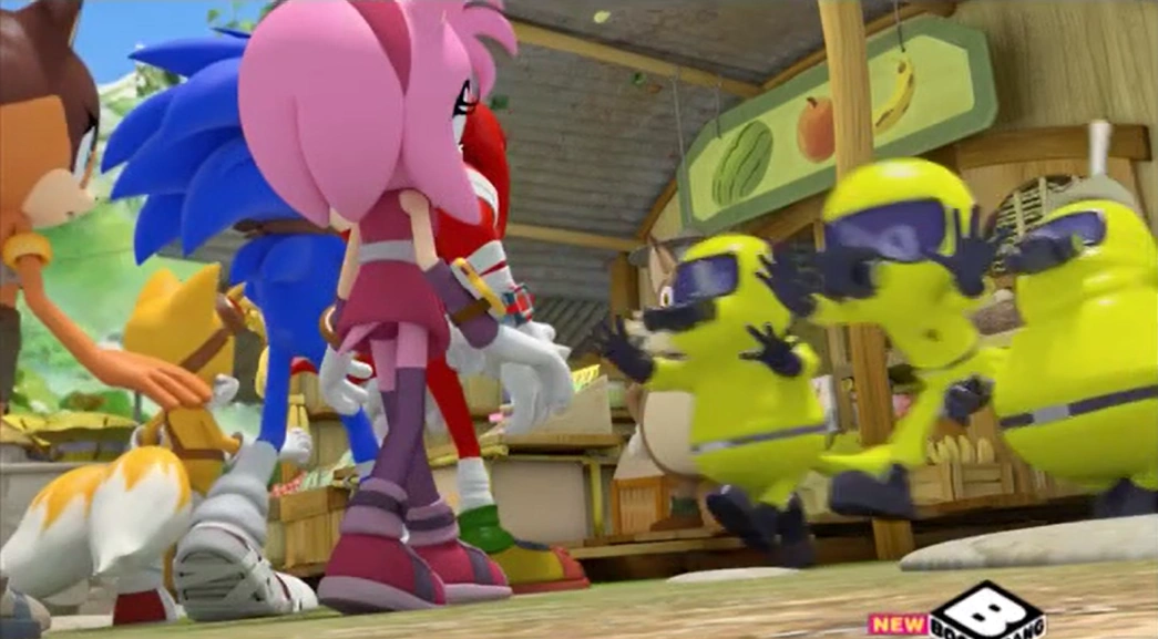 - ↑ Harrison, Reid (19 September 2015). "It Wasn't Me, It Was the One-Armed Hedgehog". Sonic Boom. Season 1. Episode 44. Cartoon Network.